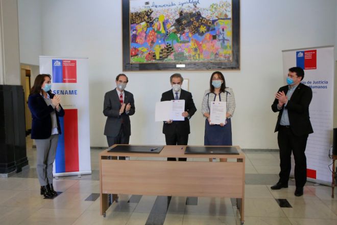 La firma de convenio se realizó esta mañana con la presencia del Ministro de Justicia y Derechos Humanos, Hernán Larraín; el Subsecretario de Justicia, Sebastián Valenzuela; la Subsecretaria de Derechos Humanos, Lorena Recabarren; la Directora Nacional (s) de Sename, Claudia de la Hoz, y el Vicepresidente Legal y Asuntos Corporativos de VTR, Miguel Oyanarte.