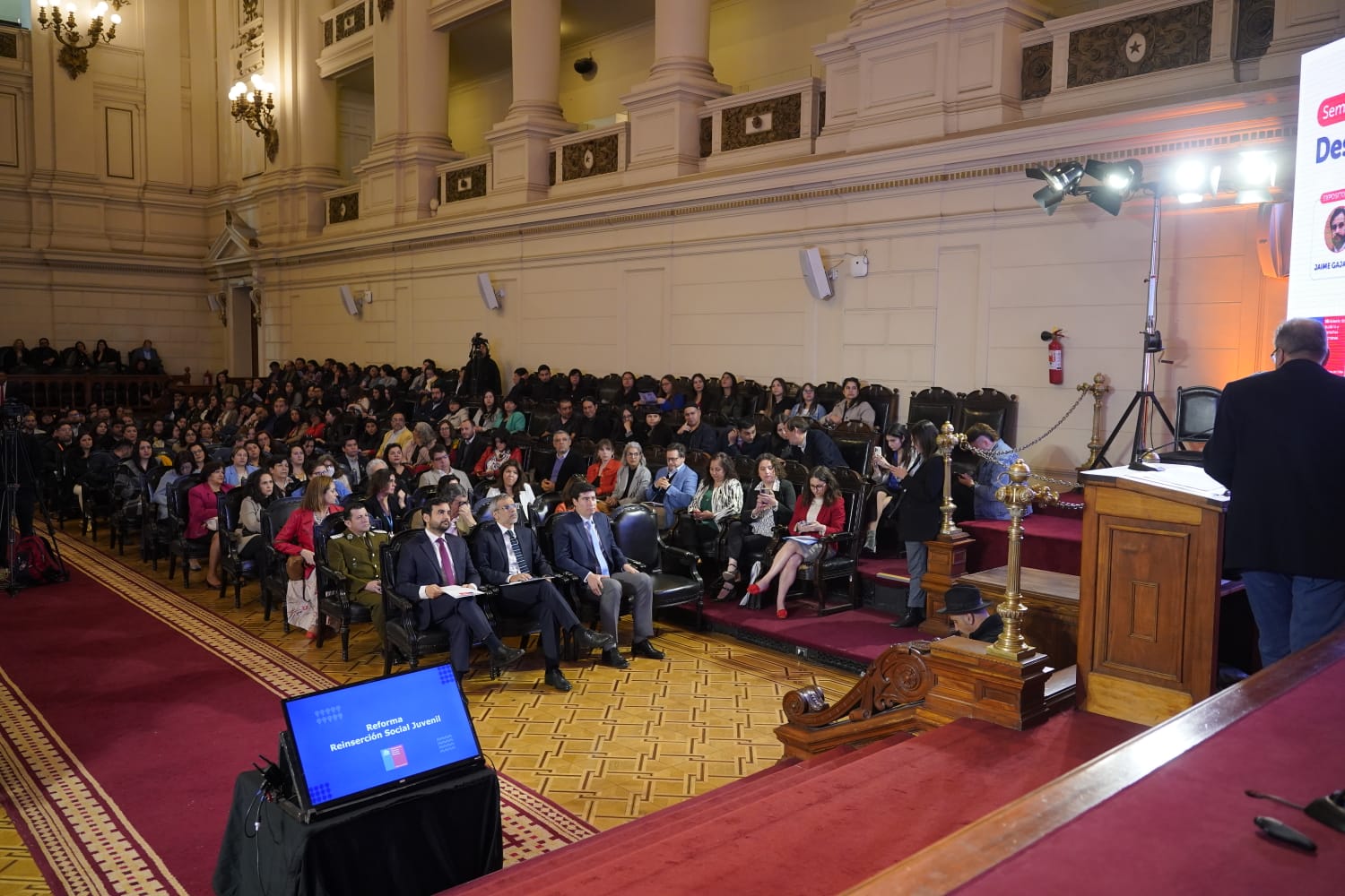 En el salón plenario del ex Congreso Nacional, el ministro de Justicia y Derechos Humanos, Luis Cordero, junto a representantes de organismos colaboradores, encabezó el Seminario Justicia Penal y Reinserción Social Juvenil: Desafíos ante un nuevo Servicio.