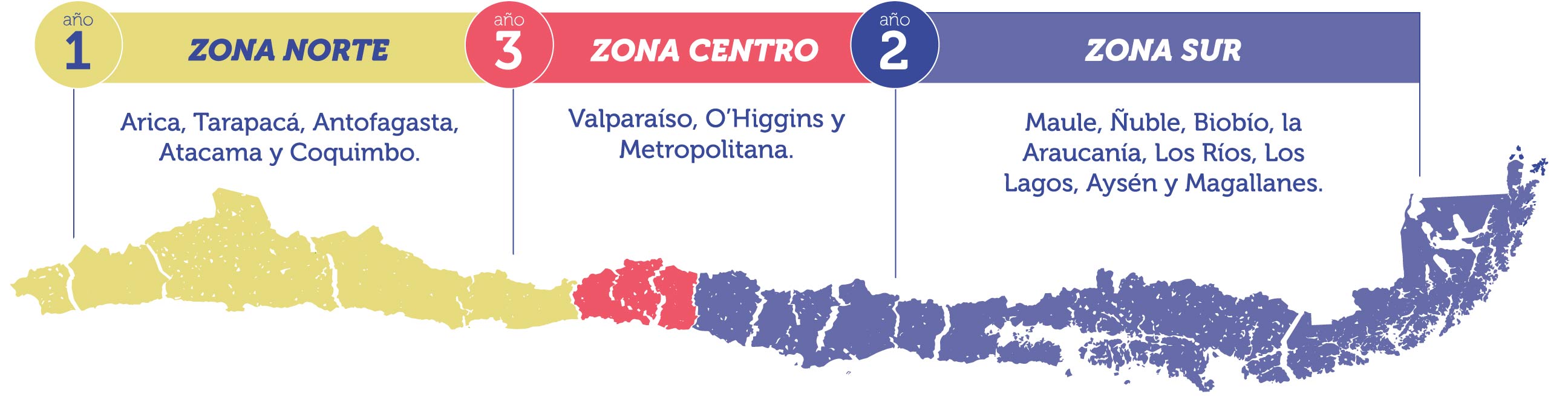 Iniciando con un año de preparación, el nuevo Servicio se implementará gradualmente por zonas a lo largo del territorio nacional, iniciando en la zona norte con las regiones de Arica y Parinacota, Tarapacá, Antofagasta, Atacama y Coquimbo; zona sur: regiones de Maule, Ñuble, Biobío, La Araucanía, Los Ríos, Los Lagos, Aysén y Magallanes; y zona centro: regiones de Valparaíso, O’Higgins y Metropolitana. Esta implementación gradual obedece a la necesidad de realizar un trabajo serio y sostenible en el tiempo, donde los aprendizajes de cada fase se incorporen en la ejecución de las siguientes.