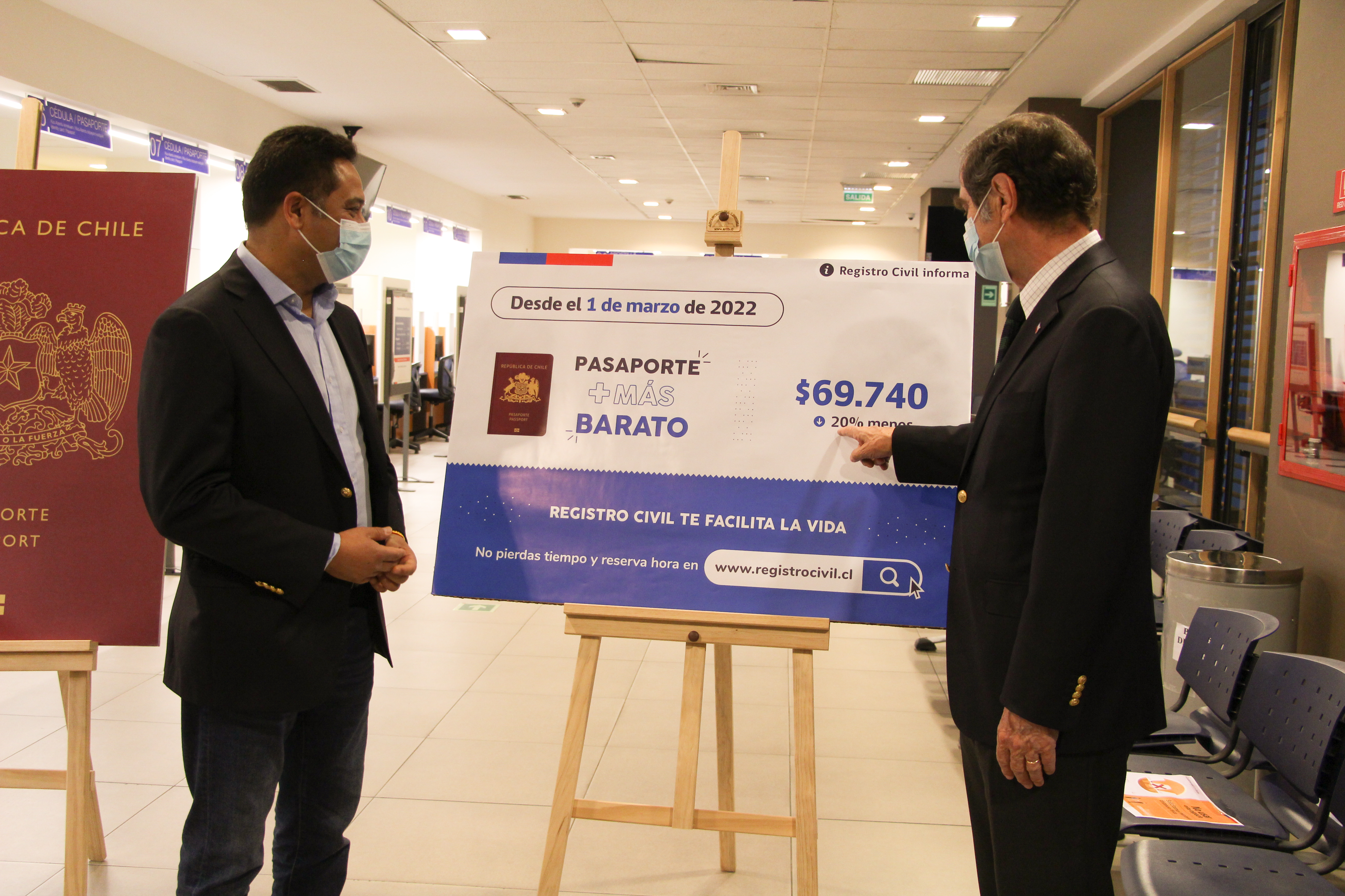 Esta mañana, el ministro de Justicia y Derechos Humanos, Hernán Larraín, junto al subsecretario de Justicia, Sebastián Valenzuela, y el director nacional del Servicio de Registro Civil e Identificación, Sergio Mierzejewski, anunciaron que el precio de los pasaportes bajará de $89.740 a $69.740, a contar del 1 de marzo.