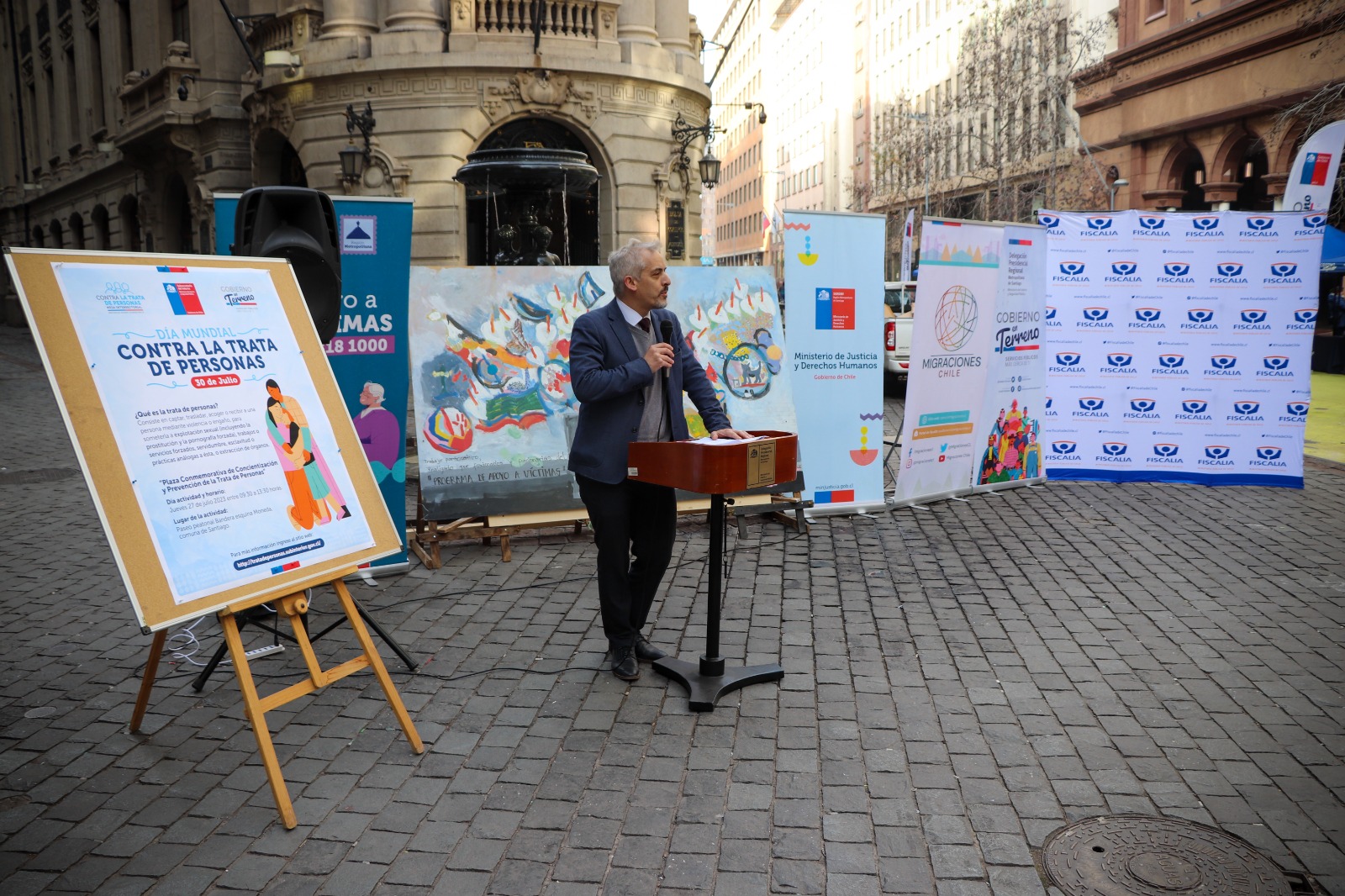En la Región Metropolitana, se desarrolló una plaza de gobierno junto a diversas instituciones, organizaciones de la sociedad civil y organismos internacionales. En la jornada se presentó un mural elaborado por el pintor Francisco Jaume Rueda y profesionales del Programa Apoyo a Víctimas, visibilizando el trabajo que realizan con las víctimas de trata de personas y su compromiso con la protección y la restitución de sus derechos.