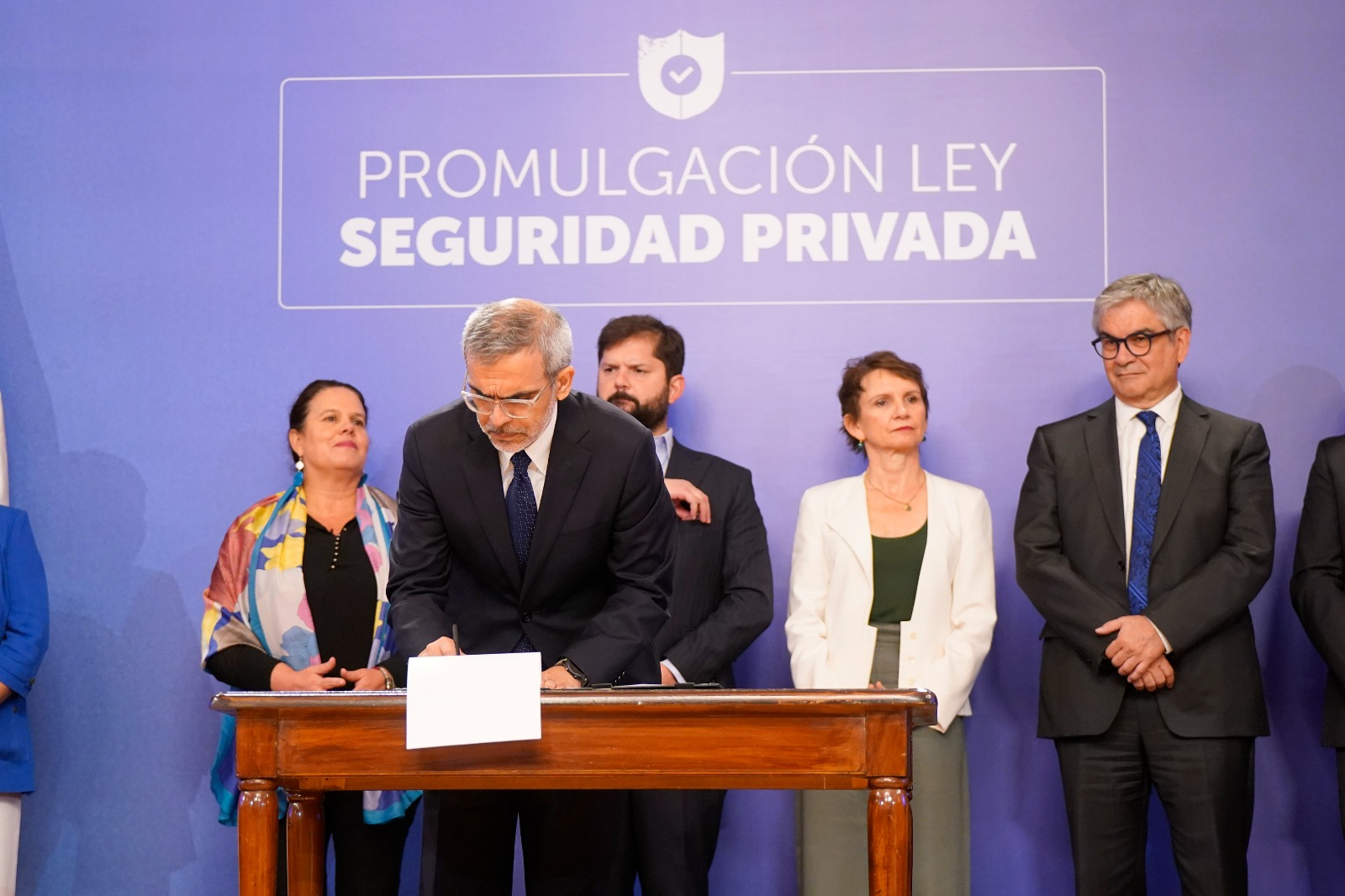 S.E. el Presidente de la República, Gabriel Boric Font, junto a la Ministra del Interior y Seguridad Pública, Carolina Tohá; el Ministro de Hacienda, Mario Marcel; el Ministro Secretario General de la Presidencia, Álvaro Elizalde; la Ministra del Trabajo y Previsión Social, Jeanette Jara; la Ministra de Defensa, Maya Fernández; el Ministro de Justicia y Derechos Humanos, Luis Cordero; y el Ministro de Transportes y Telecomunicaciones Juan Carlos Muñoz, además de parlamentarios y parlamentarias, encabezó la promulgación de la Nueva Ley de Seguridad Privada.