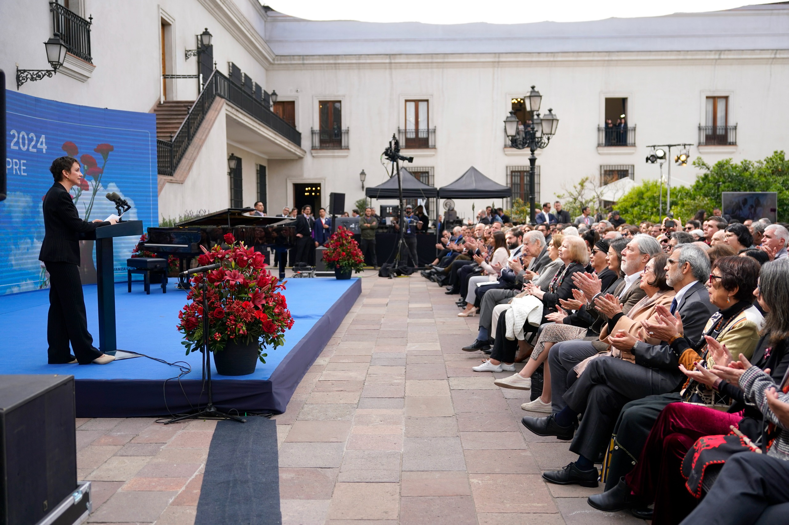 Con la interpretación del Himno Nacional por parte del coro de dirigentas “Paulette L’Huissier y sus amigas” y un minuto de silencio -en el que Alejandra Holzapfel Picarte, sobreviviente del Ex Centro de Secuestro, Tortura y Violencia Política Sexual Irán 3037; Hada Labrador Urrutia, hermana de Isidro Labrador Urrutia, militante del MIR detenido desaparecido que estuvo detenido en Irán 3037; y Montserrat Figuerola Estévez, gestora del Sitio de Memoria Irán 3037, Ex Centro de Secuestro, Tortura, Violencia y Política Sexual realizaron tres toques de gong en honor a las víctimas de la dictadura civil militar- se inició el acto de conmemoración de los 51años del Golpe de Estado del 11 de septiembre de 1973 en La Moneda.